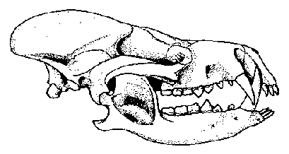 Figure 3: Skull of Arctocyon primaevus from the late Paleocene of France, a condylarth that probably included meat in its diet. Note the large canines and the low bear-like cheek teeth at the back of the jaw. Skull length about 25 cm. From Russell (1964).